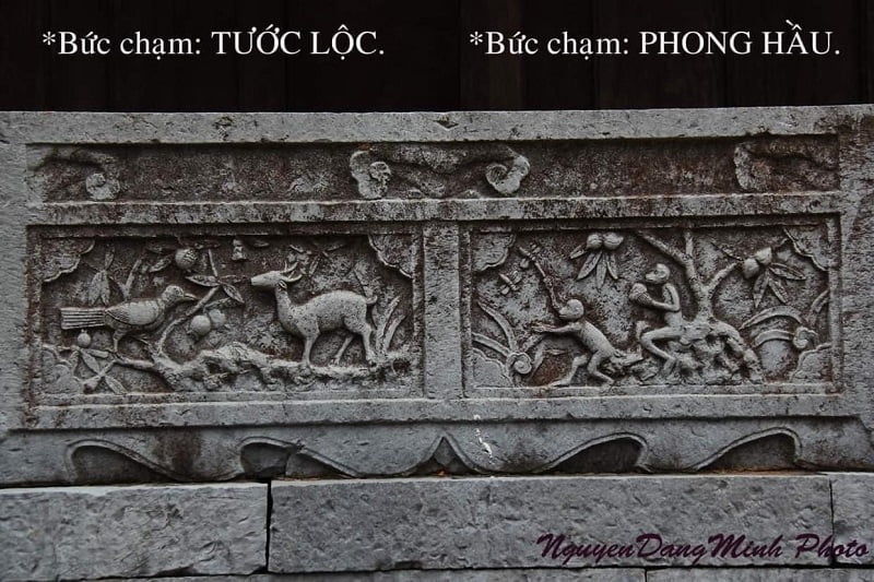 Chim sẻ (Tước), hươu (Lộc) cây Lựu biểu tượng đông con nhiều cháu, Khỉ (Hầu), Ong (Phong), cây đào tượng trưng cho trường thọ. Ý nghĩa của bức chạm thể hiện ước mong được thăng quan tiến chức, đông con nhiều cháu, đời đời hưởng phúc lộc.