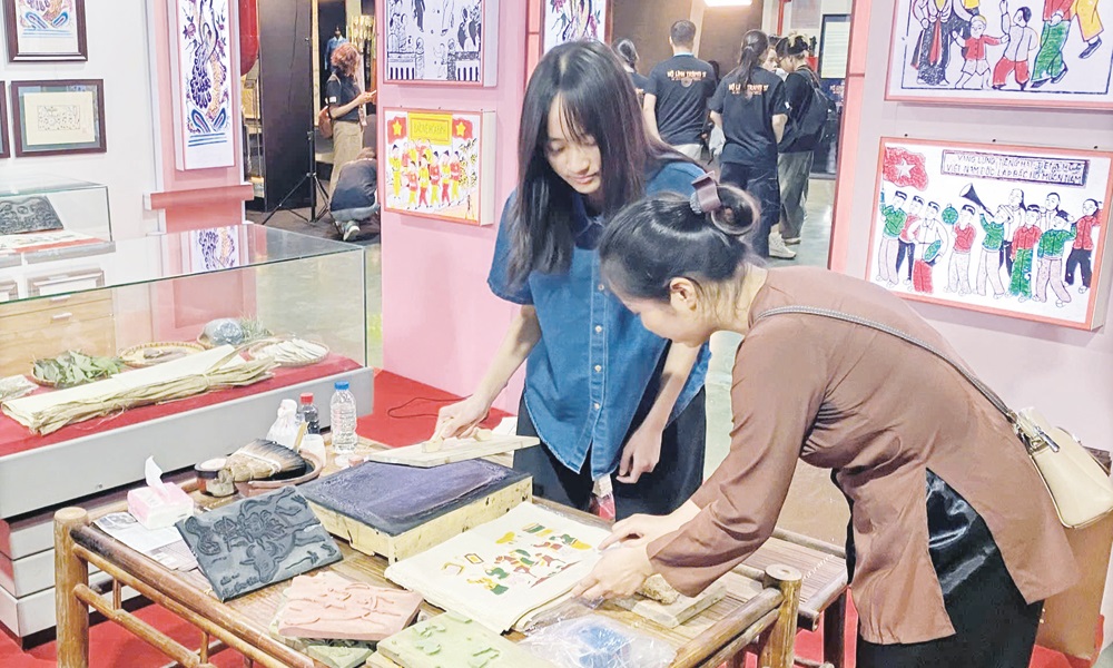 Khách tham quan trải nghiệm vẽ tranh Đông Hồ